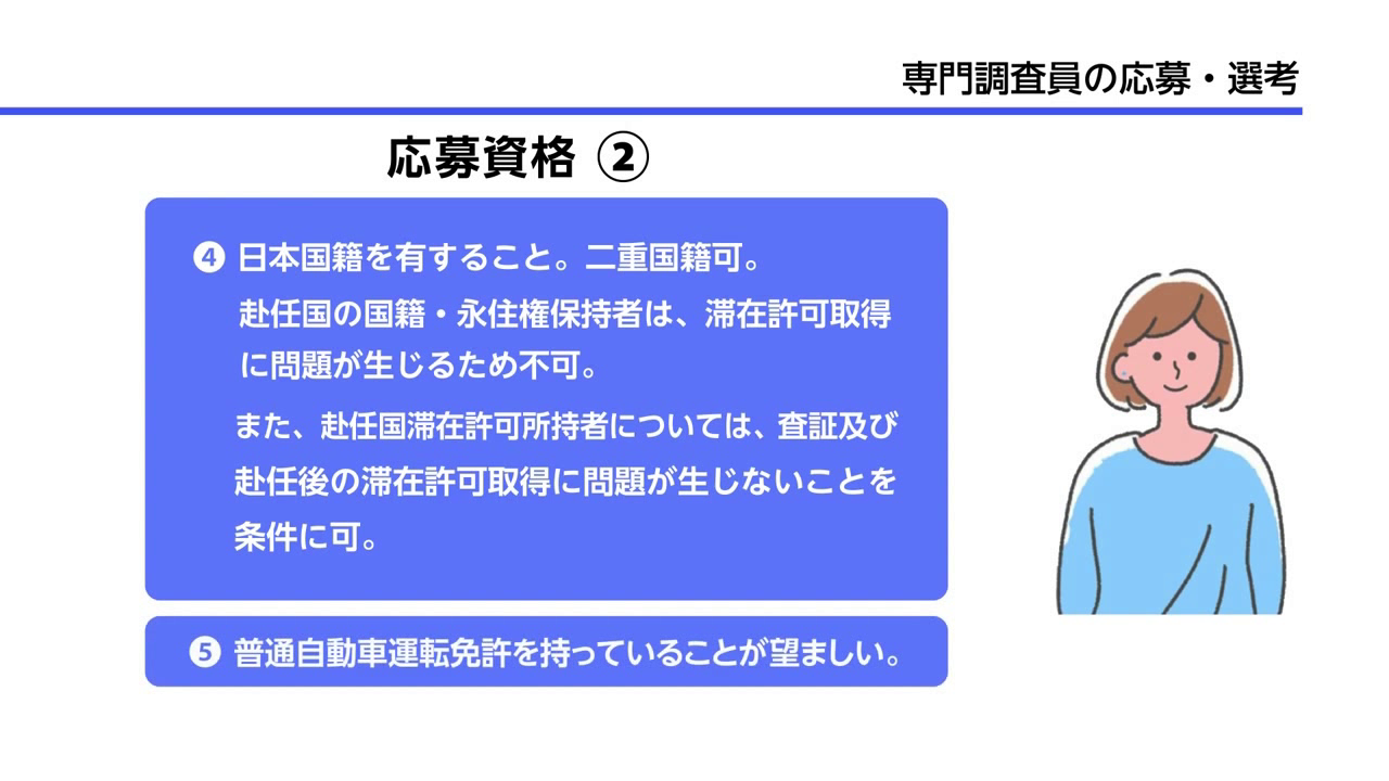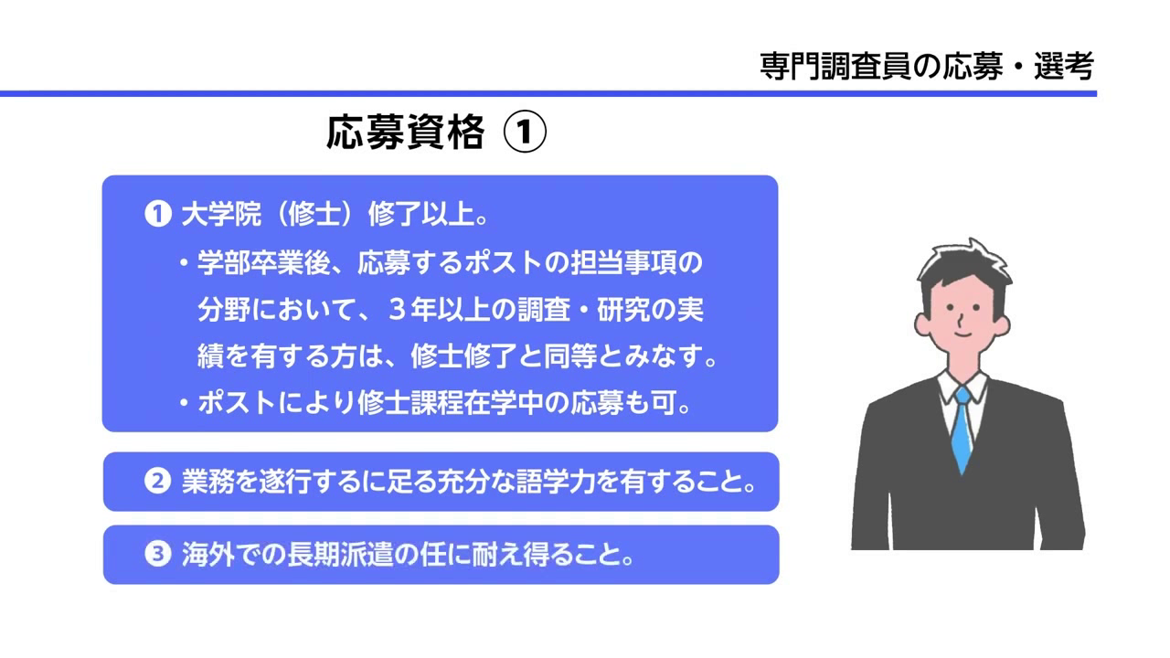 (1)大学院(修士)修了以上の者(ポストにより修士課程在学中の応募も可。募集公館リストを参照のこと)。