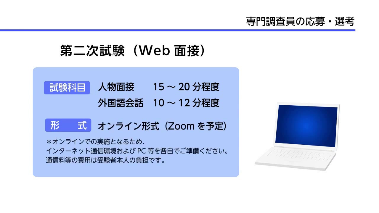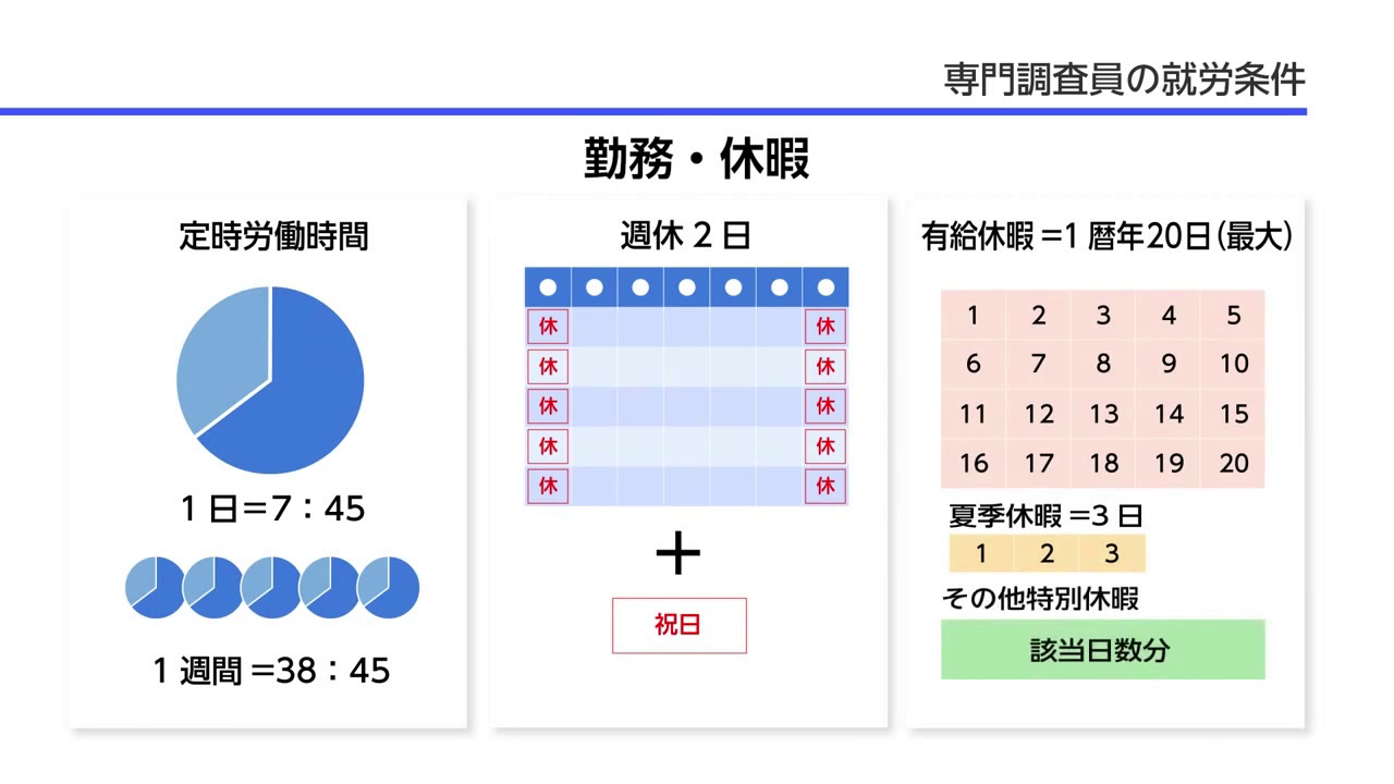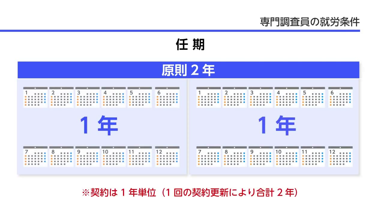 または、学部(4年制大学・学士)卒業後、応募するポストの担当事項の分野において、通算3年程度の調査・