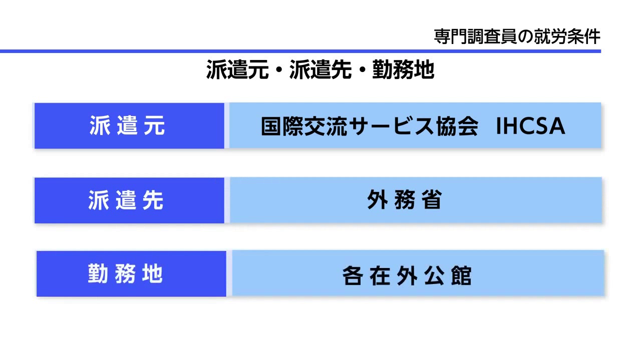 外務省在外公館専門調査員とは、在外公館の一員としてわが国の外交活動に資するため、語学力及び専門性を活かしつつ、在外公館長の指揮監督の下に、派遣国・地域の政治、経済、文化等に関する調査・研究及び館務補助の業務を行なうものです。労働者派遣法の下で、わが国の在外公館(大使館、総領事館、政府代表部、領事事務所)に原則2年の任期をもって派遣されます。